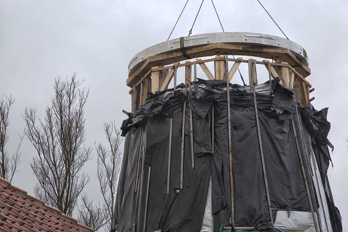 Nadat de bovenas in de kap geďnstalleerd was is op 12 mei 2017 de kap op de molenromp geplaatst. Waarna de staart en de schoren gemonteerd zijn.