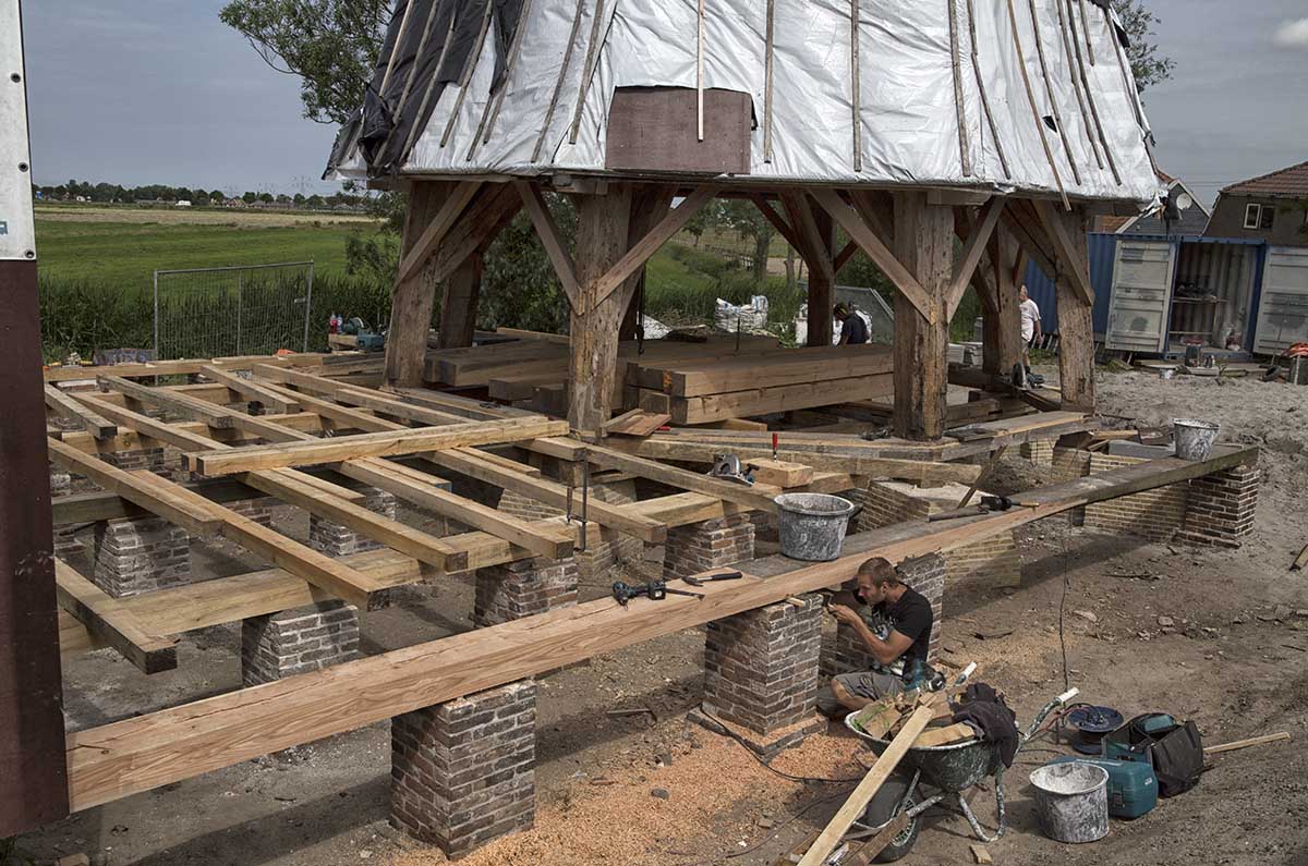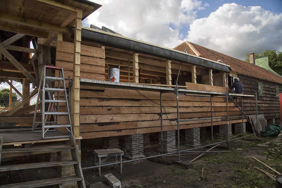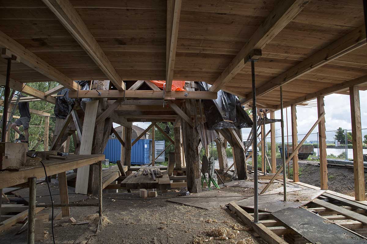Het oliehuis is vervolgens rondom de romp opgebouwd. Voor de onderslag- en vloerbalken is zoveel mogelijk van oud materiaal hergebruikt.