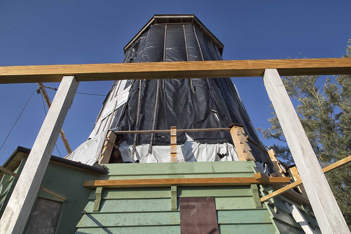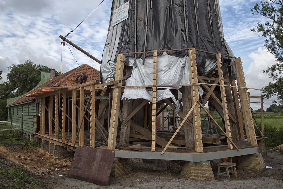 De romp van molen De Haan is aan de smalle kant. Om het silhouet te krijgen van de originele Paauw was het nodig om uitbrekers op de achtkantstijlen aan te brengen.