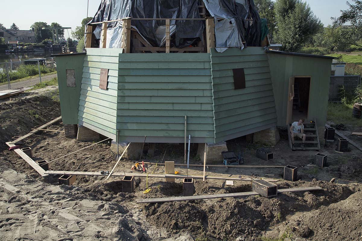 Nadat de fundering gereed was de romp op zijn definitieve plek geplaatst en waterpas gesteld was is begonnen met de constructie van het "oliehuis" en de stelling.